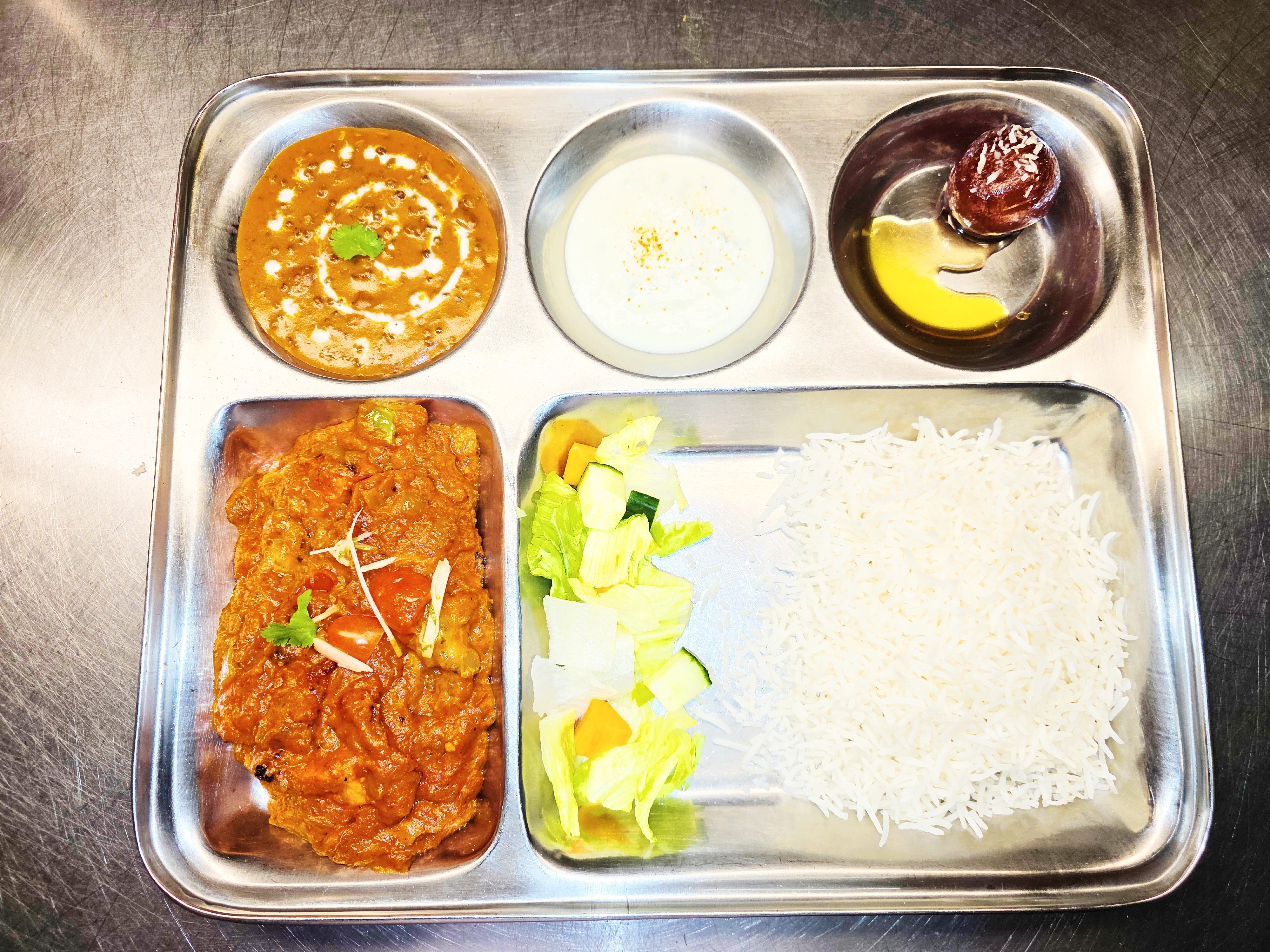 Boneless chicken breast meat prepared in tomato, onion curry and dal, rice, naan, dessert, raita and salad