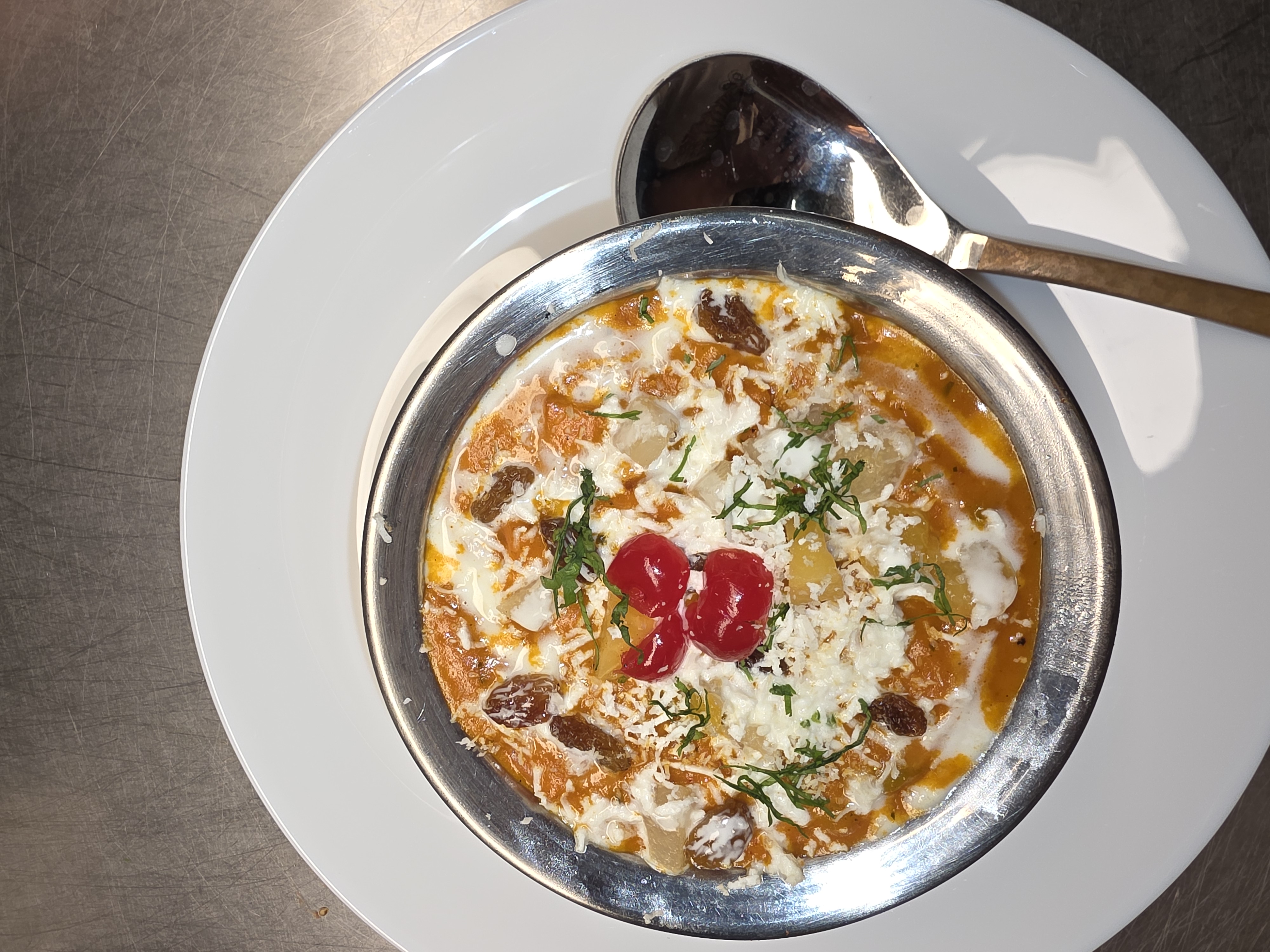 boneless chunks of meat cooked in thick cream sauce and touch with coconut powder and dal, rice, naan, dessert, raita and salad